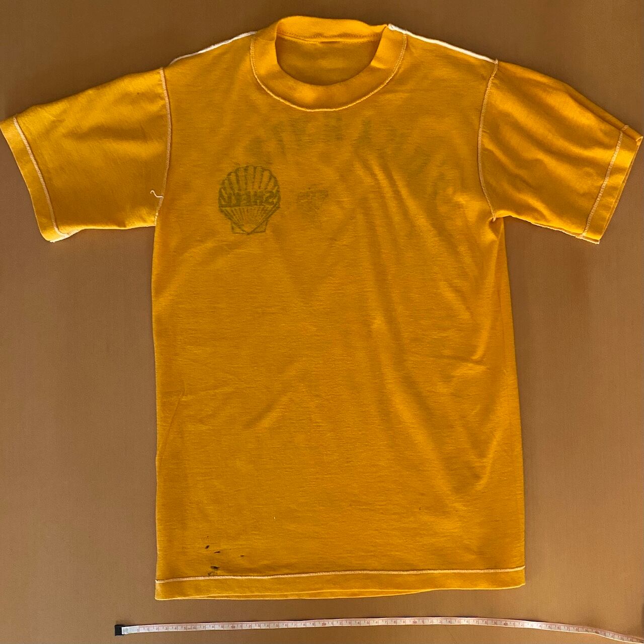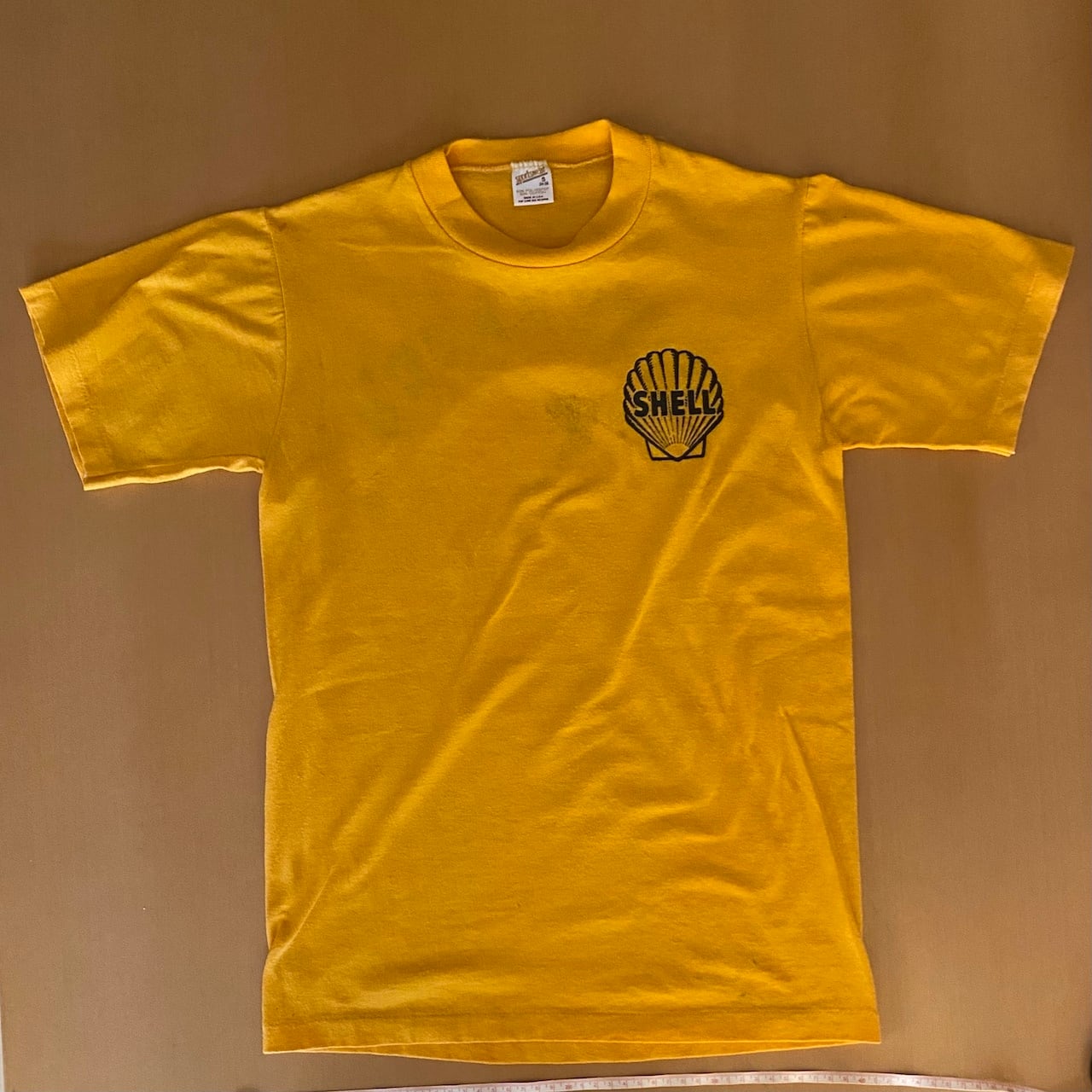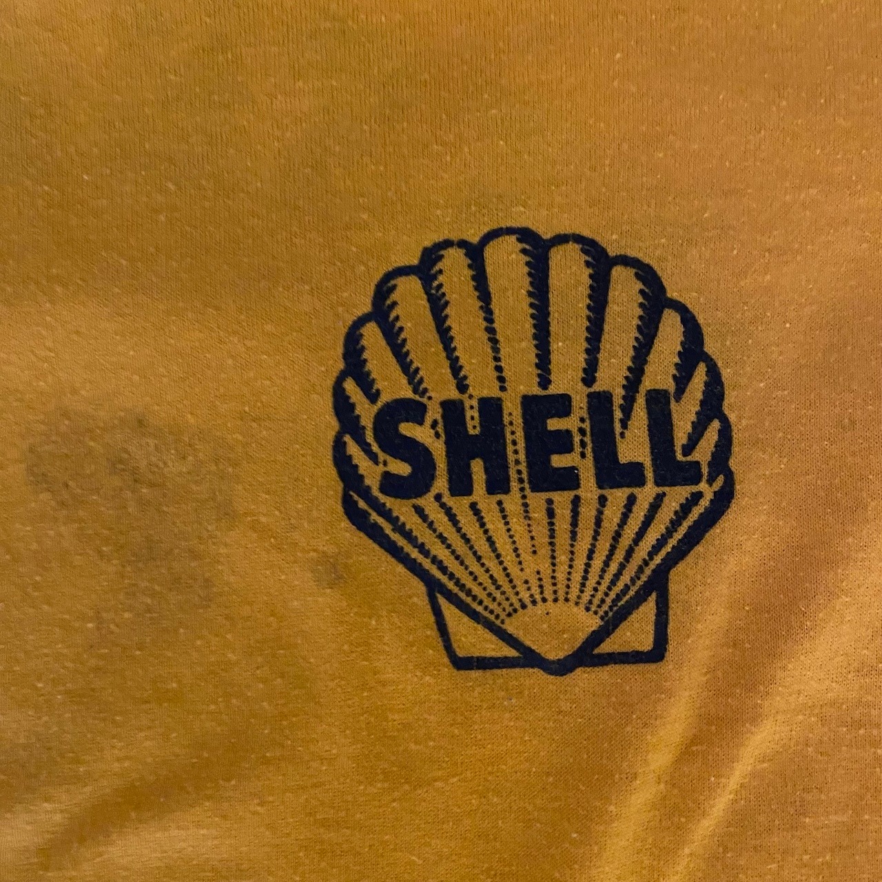 素材はこの年代特有の「50/50(コットン50%/ポリエステル50%)」で、柔らかくテロっとした質感です。左胸にシェルの象徴的なスキャロップロゴがネイビーでプリントされた、ヴィンテージ好きにはたまらない一枚です。バックプリントの METERAVD'Sのロゴも謎にかっこいいです。タグもしっかり残っており、年代物としては良好な部類ですが、ヴィンテージ特有の薄いシミがございます(写真6.7枚目参照)。古着慣れしている方であれば味として楽しんでいただける範囲かと思いますが、神経質な方はご遠慮ください。