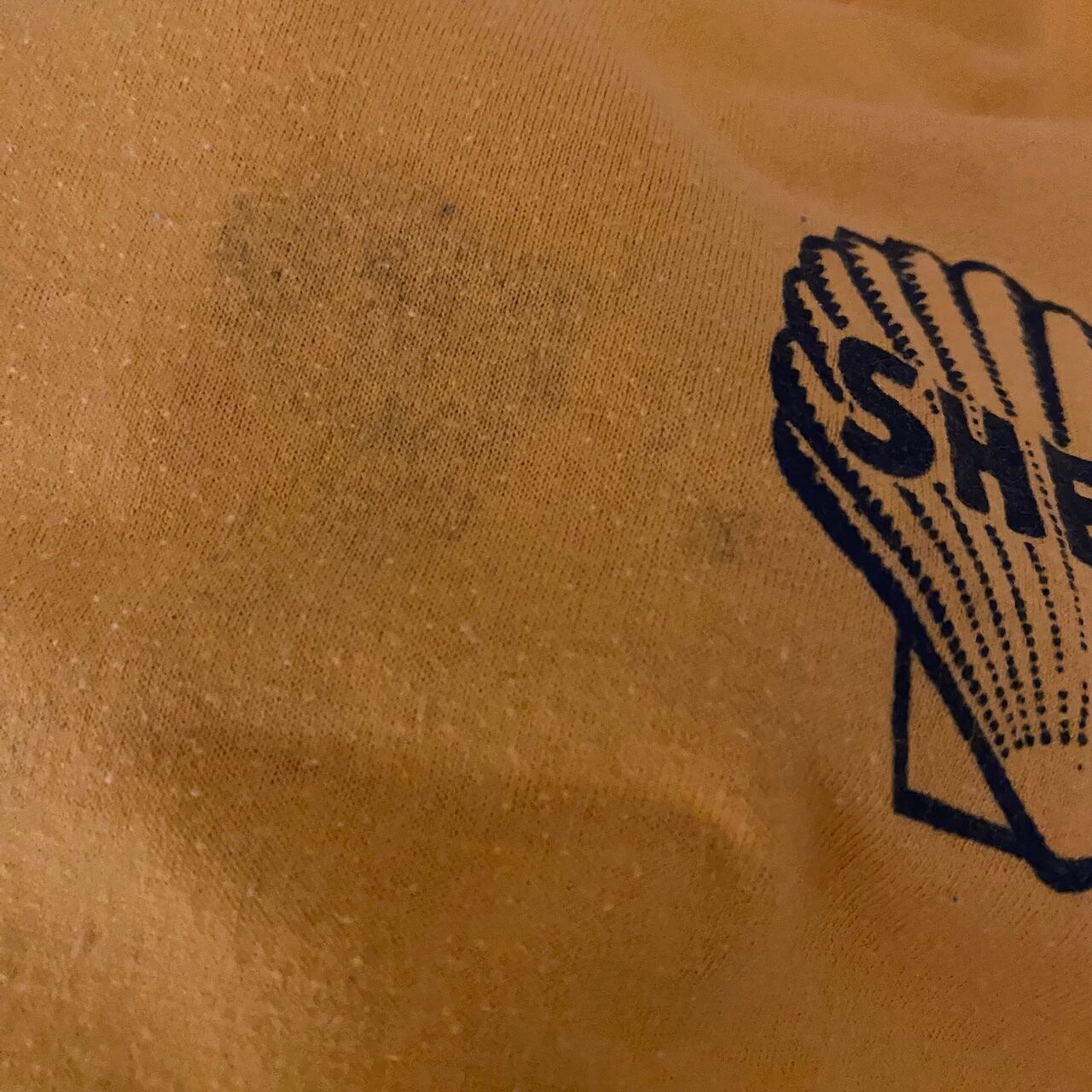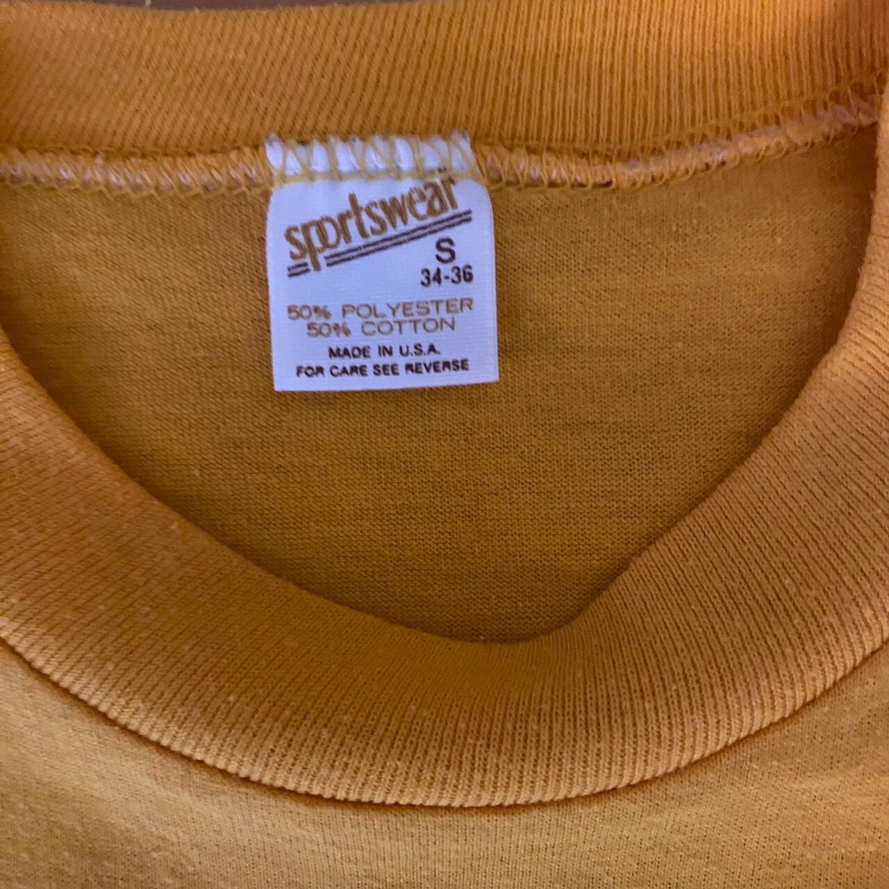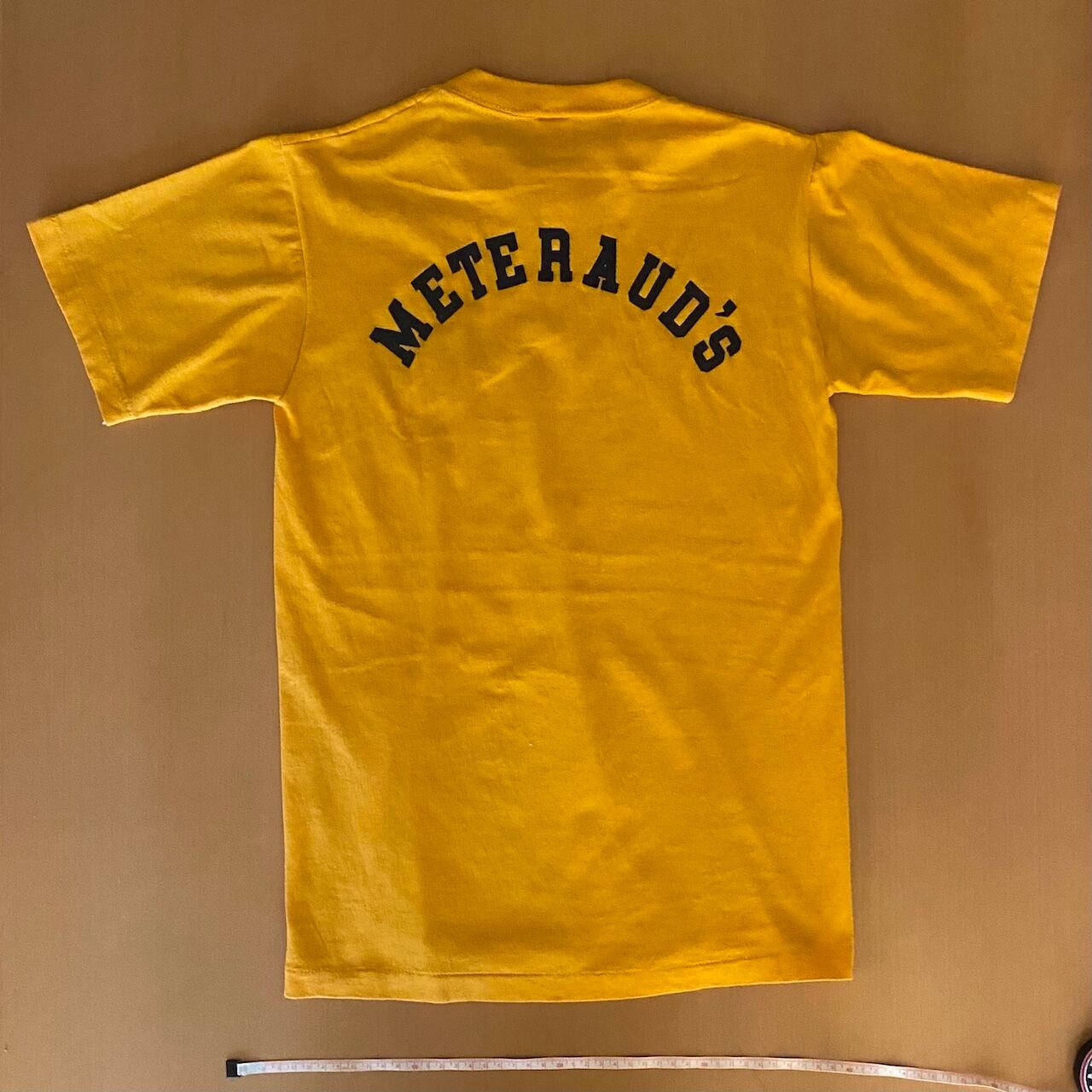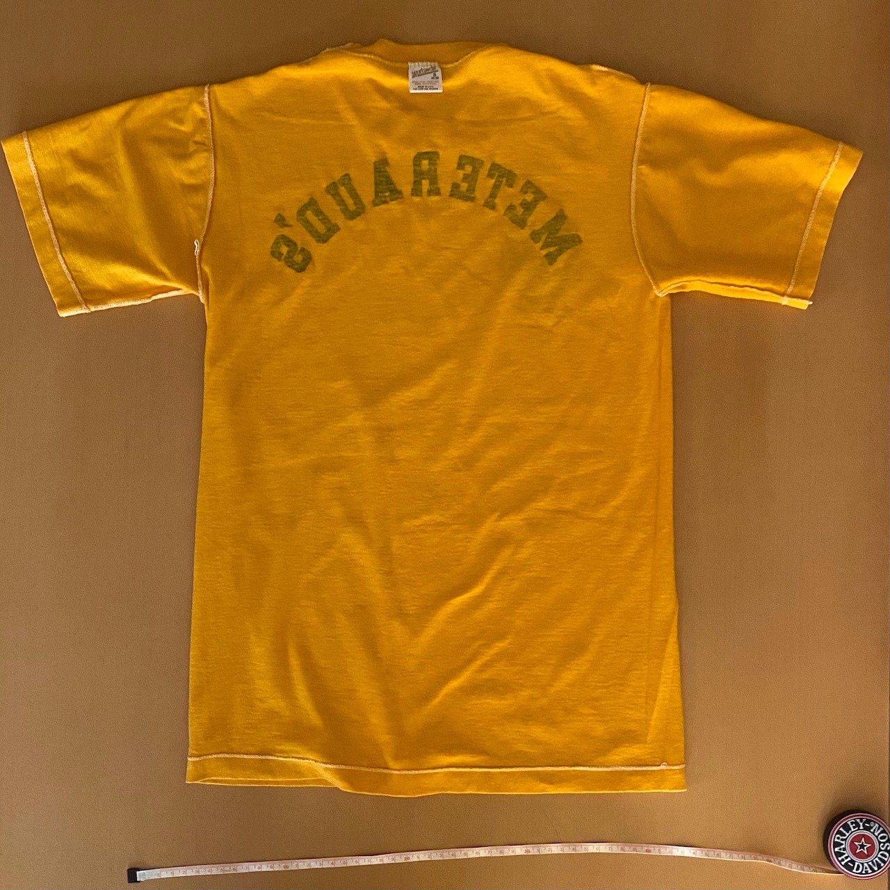 素材はこの年代特有の「50/50(コットン50%/ポリエステル50%)」で、柔らかくテロっとした質感です。左胸にシェルの象徴的なスキャロップロゴがネイビーでプリントされた、ヴィンテージ好きにはたまらない一枚です。バックプリントの METERAVD'Sのロゴも謎にかっこいいです。タグもしっかり残っており、年代物としては良好な部類ですが、ヴィンテージ特有の薄いシミがございます(写真6.7枚目参照)。古着慣れしている方であれば味として楽しんでいただける範囲かと思いますが、神経質な方はご遠慮ください。