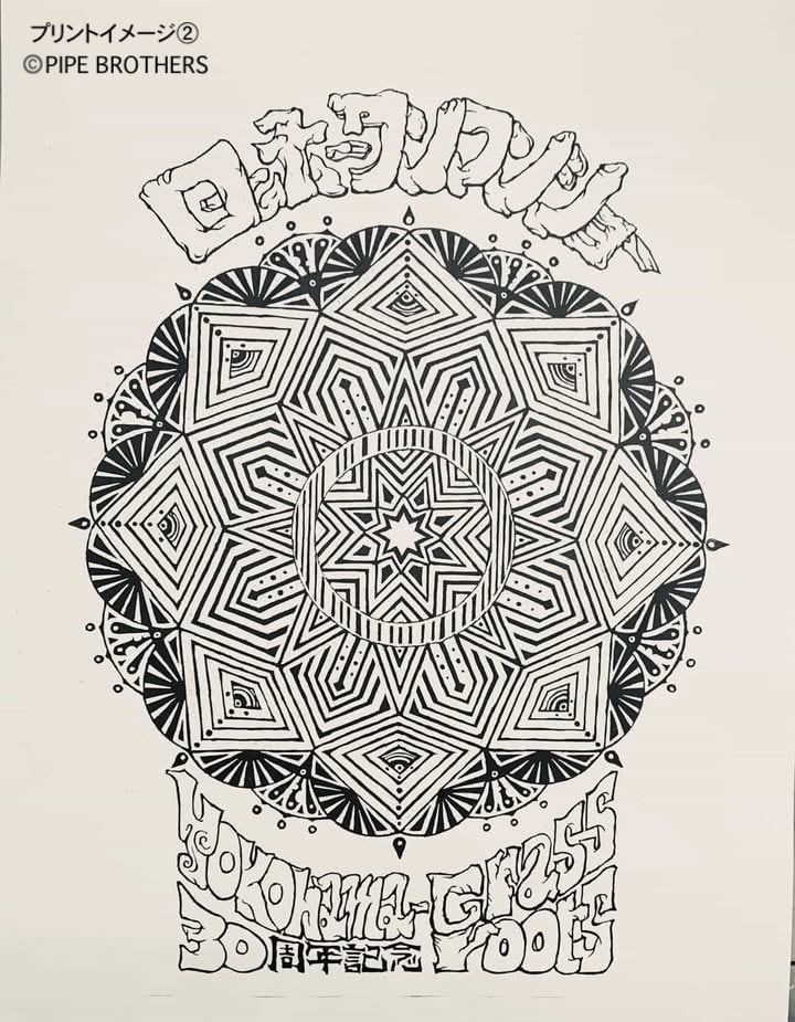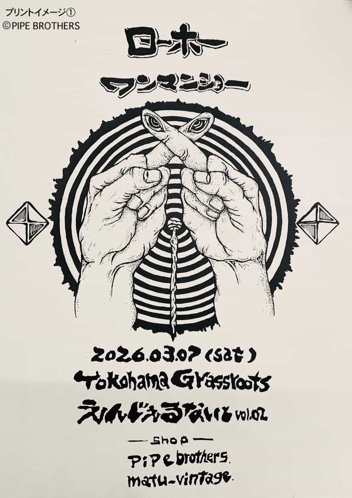 * 2026.3.7 横浜グラスルーツ ローホーワンマンライブのための描き下ろし図案(PIPE BROTHERS takapit氏による)プリントを希望の場合は、配送先を神奈川県としてコメント欄に直送希望と明記してください。こちらからPIPE BROTHERSアトリへ宛てに発送いたします。図案のプリント位置やカラーについてはえんじぇる企画かPIPEBROTHERSインスタグラムDM等で直接ご注文ください。(シルクスクリーンプリント代別途かかります)